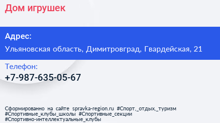 Дом игрушек по адресу Ульяновская область, Димитровград, Гвардейская, 21 в дальнейшем Организация, размещена в следующих категориях: