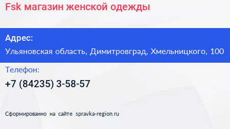Fsk, магазин женской одежды по адресу Ульяновская область, Димитровград, Хмельницкого, 100 в дальнейшем Организация, размещена в следующих категориях: