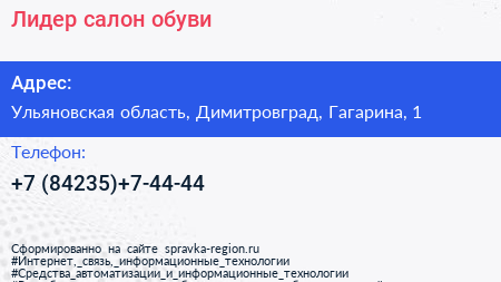 Лидер, салон обуви по адресу Ульяновская область, Димитровград, Гагарина, 1 в дальнейшем Организация, размещена в следующих категориях: