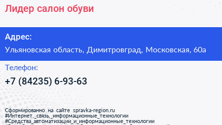 Лидер, салон обуви по адресу Ульяновская область, Димитровград, Московская, 60а в дальнейшем Организация, размещена в следующих категориях: