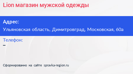 Lion, магазин мужской одежды по адресу Ульяновская область, Димитровград, Московская, 60а в дальнейшем Организация, размещена в следующих категориях: