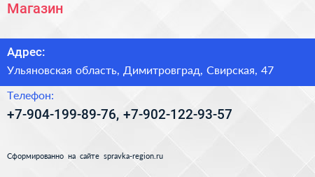 Магазин по адресу Ульяновская область, Димитровград, Свирская, 47 в дальнейшем Организация, размещена в следующих категориях: