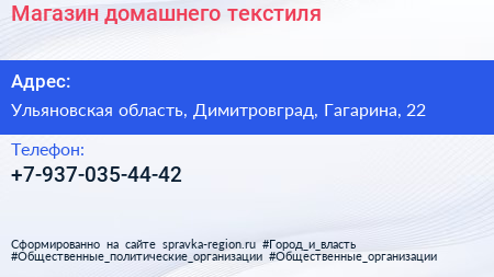 Магазин домашнего текстиля по адресу Ульяновская область, Димитровград, Гагарина, 22 в дальнейшем Организация, размещена в следующих категориях: