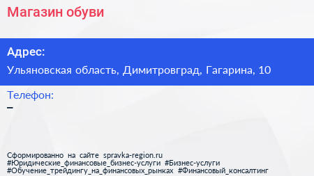 Магазин обуви по адресу Ульяновская область, Димитровград, Гагарина, 10 в дальнейшем Организация, размещена в следующих категориях: