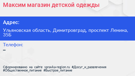 Максим, магазин детской одежды по адресу Ульяновская область, Димитровград, проспект Ленина, 35Б в дальнейшем Организация, размещена в следующих категориях: