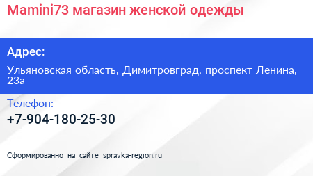 Mamini73, магазин женской одежды по адресу Ульяновская область, Димитровград, проспект Ленина, 23а в дальнейшем Организация, размещена в следующих категориях: