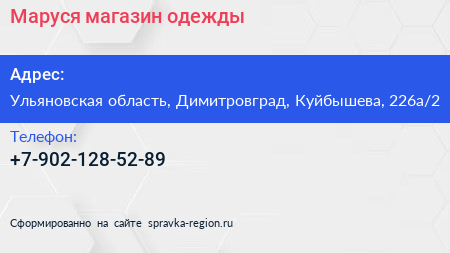 Маруся, магазин одежды по адресу Ульяновская область, Димитровград, Куйбышева, 226а/2 в дальнейшем Организация, размещена в следующих категориях: