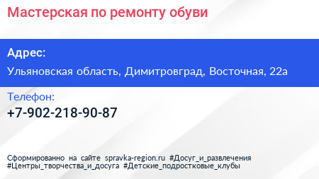 Мастерская по ремонту обуви по адресу Ульяновская область, Димитровград, Восточная, 22а в дальнейшем Организация, размещена в следующих категориях: