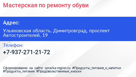 Мастерская по ремонту обуви по адресу Ульяновская область, Димитровград, проспект Автостроителей, 19 в дальнейшем Организация, размещена в следующих категориях: