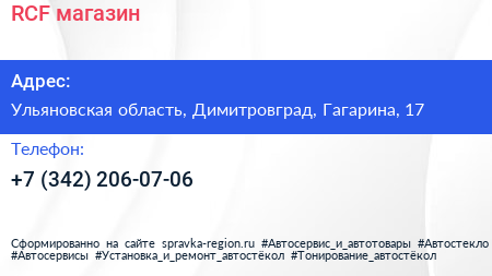 RCF, магазин по адресу Ульяновская область, Димитровград, Гагарина, 17 в дальнейшем Организация, размещена в следующих категориях: