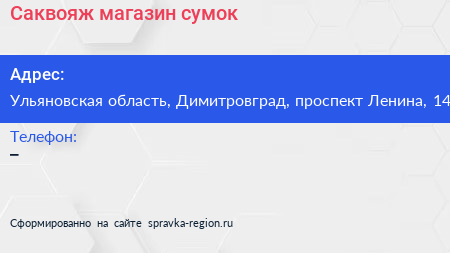 Саквояж, магазин сумок по адресу Ульяновская область, Димитровград, проспект Ленина, 14 в дальнейшем Организация, размещена в следующих категориях: