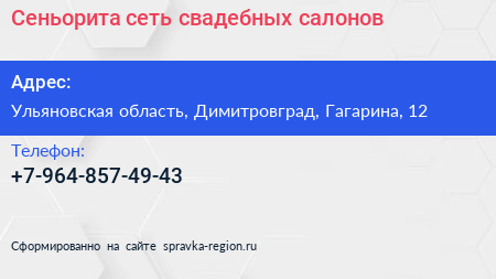 Сеньорита, сеть свадебных салонов по адресу Ульяновская область, Димитровград, Гагарина, 12 в дальнейшем Организация, размещена в следующих категориях: