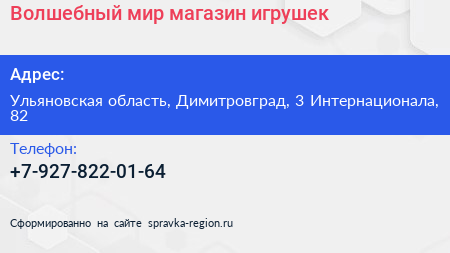 Волшебный мир, магазин игрушек по адресу Ульяновская область, Димитровград, 3 Интернационала, 82 в дальнейшем Организация, размещена в следующих категориях: