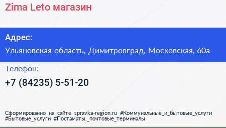 Zima-Leto, магазин по адресу Ульяновская область, Димитровград, Московская, 60а в дальнейшем Организация, размещена в следующих категориях: