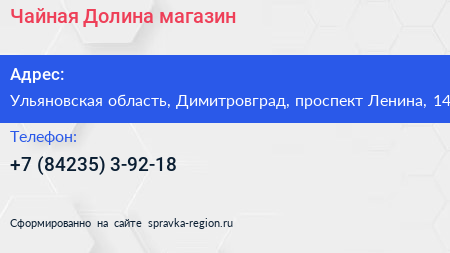 Чайная Долина, магазин по адресу Ульяновская область, Димитровград, проспект Ленина, 14 в дальнейшем Организация, размещена в следующих категориях: