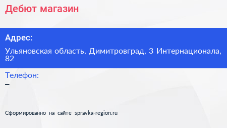 Дебют, магазин по адресу Ульяновская область, Димитровград, 3 Интернационала, 82 в дальнейшем Организация, размещена в следующих категориях: