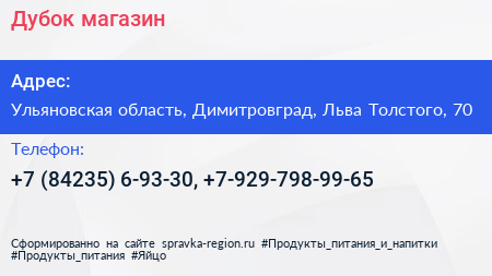 Дубок, магазин по адресу Ульяновская область, Димитровград, Льва Толстого, 70 в дальнейшем Организация, размещена в следующих категориях: