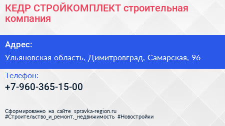 КЕДР-СТРОЙКОМПЛЕКТ, строительная компания по адресу Ульяновская область, Димитровград, Самарская, 96 в дальнейшем Организация, размещена в следующих категориях: