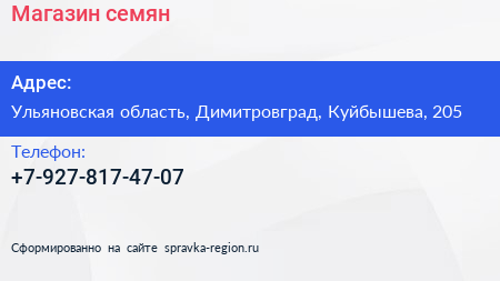 Магазин семян по адресу Ульяновская область, Димитровград, Куйбышева, 205 в дальнейшем Организация, размещена в следующих категориях: