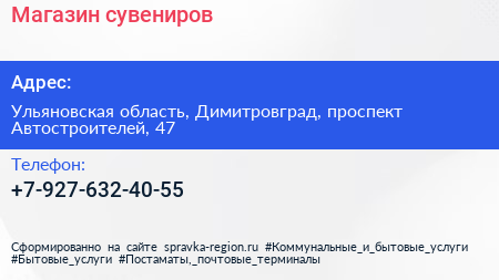 Магазин сувениров по адресу Ульяновская область, Димитровград, проспект Автостроителей, 47 в дальнейшем Организация, размещена в следующих категориях: