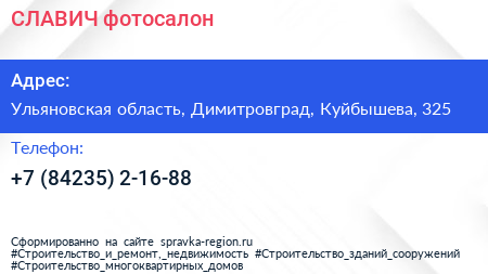СЛАВИЧ, фотосалон по адресу Ульяновская область, Димитровград, Куйбышева, 325 в дальнейшем Организация, размещена в следующих категориях: