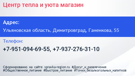 Центр тепла и уюта, магазин по адресу Ульяновская область, Димитровград, Ганенкова, 55 в дальнейшем Организация, размещена в следующих категориях: