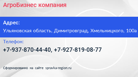 АгроБизнес, компания по адресу Ульяновская область, Димитровград, Хмельницкого, 100а в дальнейшем Организация, размещена в следующих категориях: