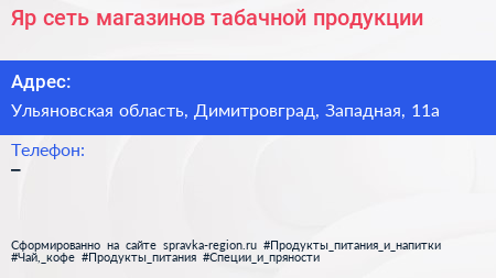 Яр, сеть магазинов табачной продукции по адресу Ульяновская область, Димитровград, Западная, 11а в дальнейшем Организация, размещена в следующих категориях: