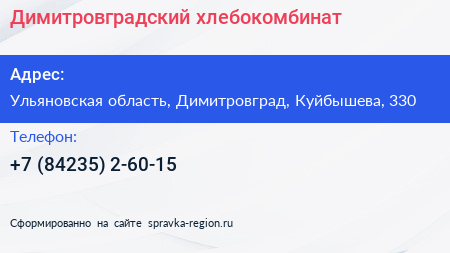Димитровградский хлебокомбинат по адресу Ульяновская область, Димитровград, Куйбышева, 330 в дальнейшем Организация, размещена в следующих категориях: