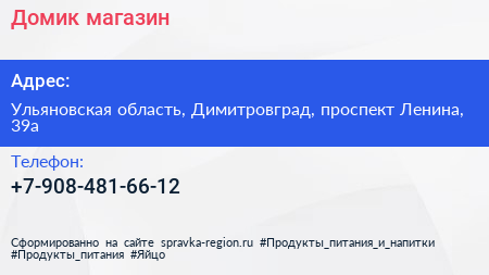 Домик, магазин по адресу Ульяновская область, Димитровград, проспект Ленина, 39а в дальнейшем Организация, размещена в следующих категориях: