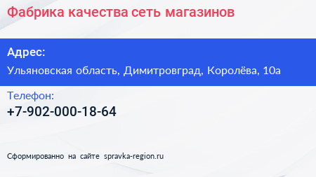 Фабрика качества, сеть магазинов по адресу Ульяновская область, Димитровград, Королёва, 10а в дальнейшем Организация, размещена в следующих категориях: