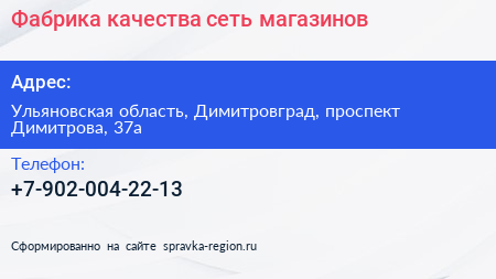 Фабрика качества, сеть магазинов по адресу Ульяновская область, Димитровград, проспект Димитрова, 37а в дальнейшем Организация, размещена в следующих категориях: