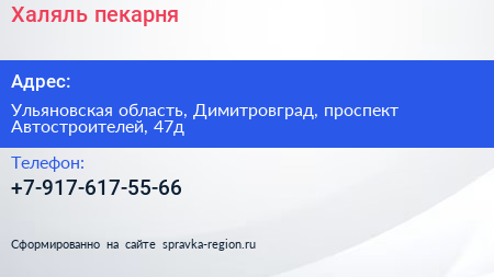 Халяль, пекарня по адресу Ульяновская область, Димитровград, проспект Автостроителей, 47д в дальнейшем Организация, размещена в следующих категориях: