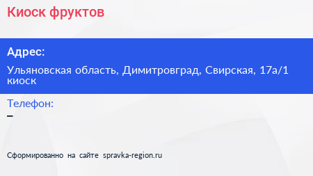 Киоск фруктов по адресу Ульяновская область, Димитровград, Свирская, 17а/1 киоск в дальнейшем Организация, размещена в следующих категориях: