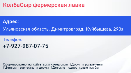 КолбаСыр, фермерская лавка по адресу Ульяновская область, Димитровград, Куйбышева, 293а в дальнейшем Организация, размещена в следующих категориях: