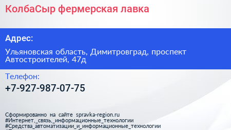 КолбаСыр, фермерская лавка по адресу Ульяновская область, Димитровград, проспект Автостроителей, 47д в дальнейшем Организация, размещена в следующих категориях: