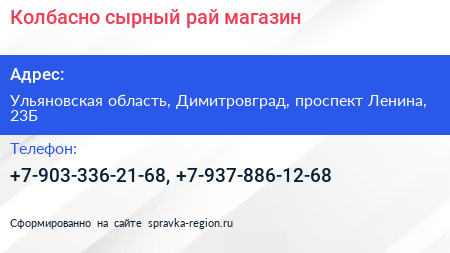 Колбасно-сырный рай, магазин по адресу Ульяновская область, Димитровград, проспект Ленина, 23Б в дальнейшем Организация, размещена в следующих категориях: