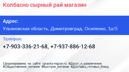 Колбасно-сырный рай, магазин по адресу Ульяновская область, Димитровград, Осипенко, 1а/5 в дальнейшем Организация, размещена в следующих категориях: