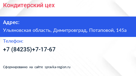 Кондитерский цех по адресу Ульяновская область, Димитровград, Потаповой, 145а в дальнейшем Организация, размещена в следующих категориях: