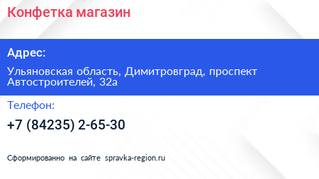Конфетка, магазин по адресу Ульяновская область, Димитровград, проспект Автостроителей, 32а в дальнейшем Организация, размещена в следующих категориях: