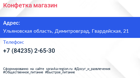 Конфетка, магазин по адресу Ульяновская область, Димитровград, Гвардейская, 21 в дальнейшем Организация, размещена в следующих категориях: