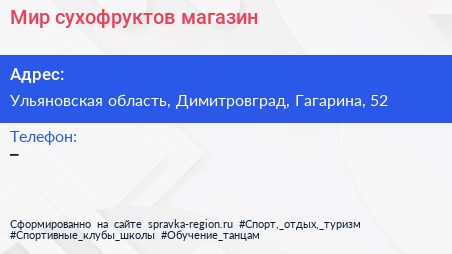 Мир сухофруктов, магазин по адресу Ульяновская область, Димитровград, Гагарина, 52 в дальнейшем Организация, размещена в следующих категориях: