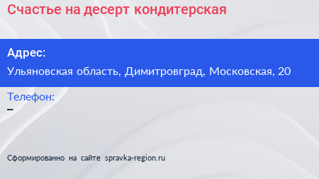 Счастье на десерт, кондитерская по адресу Ульяновская область, Димитровград, Московская, 20 в дальнейшем Организация, размещена в следующих категориях: