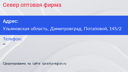 Север, оптовая фирма по адресу Ульяновская область, Димитровград, Потаповой, 145/2 в дальнейшем Организация, размещена в следующих категориях: