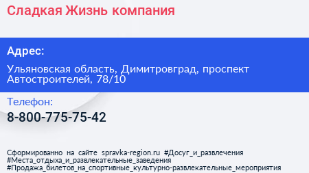 Сладкая Жизнь, компания по адресу Ульяновская область, Димитровград, проспект Автостроителей, 78/10 в дальнейшем Организация, размещена в следующих категориях: