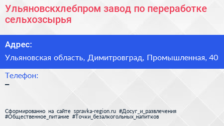 Ульяновскхлебпром, завод по переработке сельхозсырья по адресу Ульяновская область, Димитровград, Промышленная, 40 в дальнейшем Организация, размещена в следующих категориях: