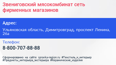 Звениговский мясокомбинат, сеть фирменных магазинов по адресу Ульяновская область, Димитровград, проспект Ленина, 26а в дальнейшем Организация, размещена в следующих категориях: