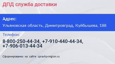 ДПД, служба доставки по адресу Ульяновская область, Димитровград, Куйбышева, 188 в дальнейшем Организация, размещена в следующих категориях: