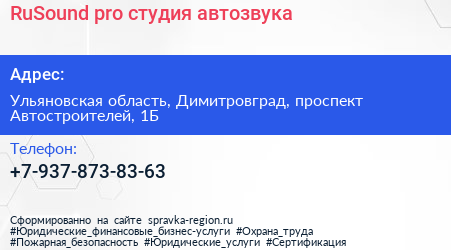 RuSound.pro, студия автозвука по адресу Ульяновская область, Димитровград, проспект Автостроителей, 1Б в дальнейшем Организация, размещена в следующих категориях: