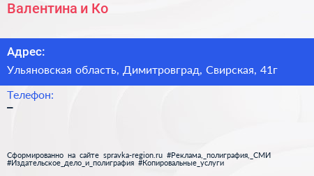 Валентина и Ко по адресу Ульяновская область, Димитровград, Свирская, 41г в дальнейшем Организация, размещена в следующих категориях: